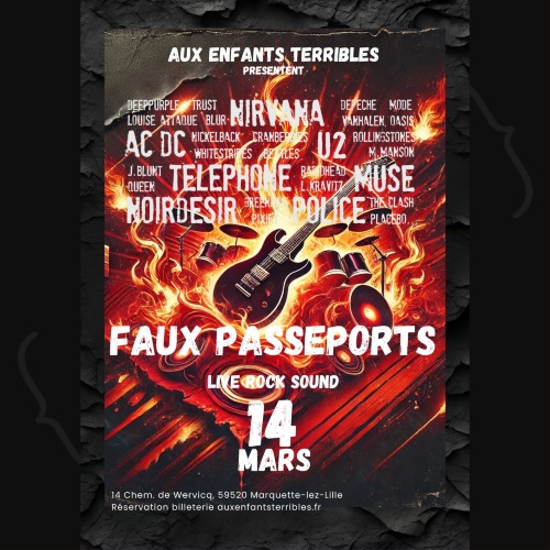 Faux Passeports vous embarque sur la route du Rock. U2, Police, Muse, Téléphone, AC/DC, Nirvana, Noir Désir ou encore Placebo, ce sont des dizaines de titres incontournables du rock des années 70 à aujourd'hui avec comme point commun la reconnaissance immédiate dès le 1er riff, et l'énergie électrisante du bon gros son qu'on aime.